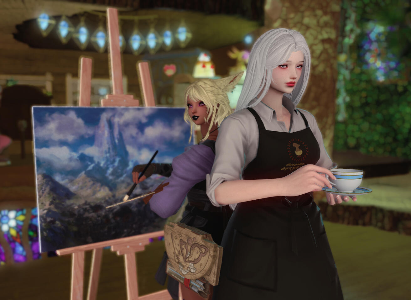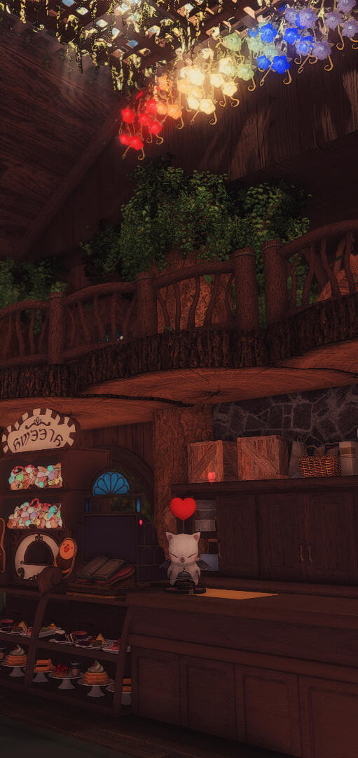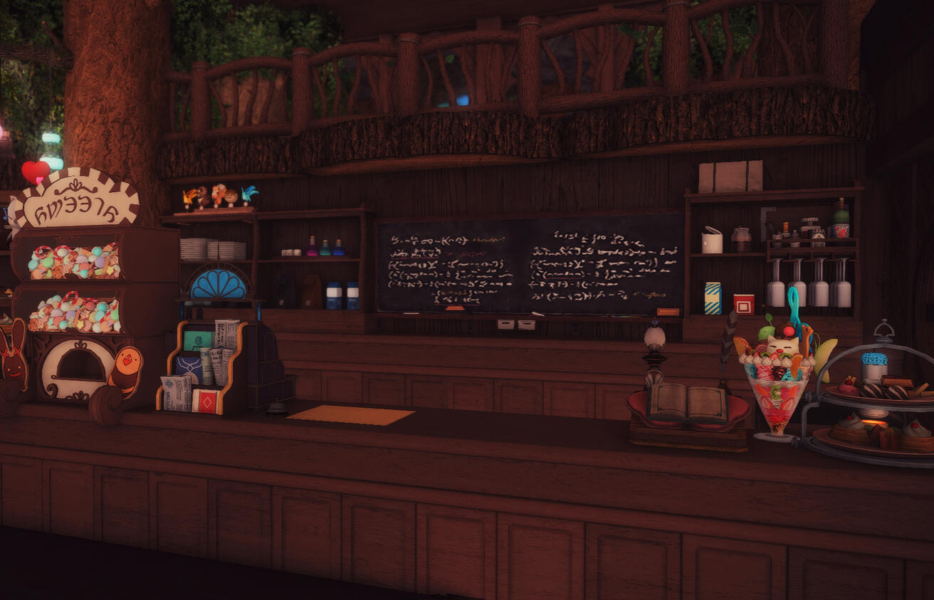 When you walk into the courtyard of the Rainbow Cafe, you are lulled into a sense of comfort. The air smells of lavender and the faint sweetness of baked goods, the balmy breeze of the Black Shroud's most temperate weather caressing you like a warm hug.Past the gate, the humble gardens are sparkling with care. You can hear the distant snuffling of happy chocobos and buzzing bees hovering among the flowers. This place teems with life.Once inside, your troubles are eased by the distant trickle of waterfalls, the smell of wood and coffee and aged paper. The air is touched with the sweet, heady aroma of Elpis flowers. The atmosphere is as timeless as it is welcoming.A server behind the counter greets you with warmth, and it becomes clear that all are welcome in this space.The staff takes your order, then prepares your drink and snack to perfection. Perhaps there is an enchantment at work here, for despite the winding halls and comfortably cozy rooms, there is always a private nook to be found.